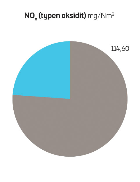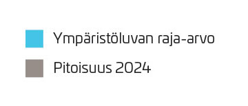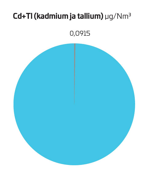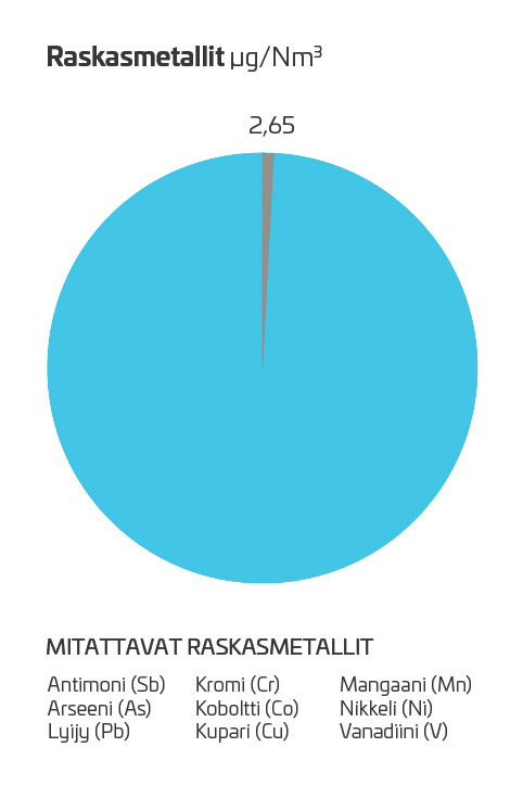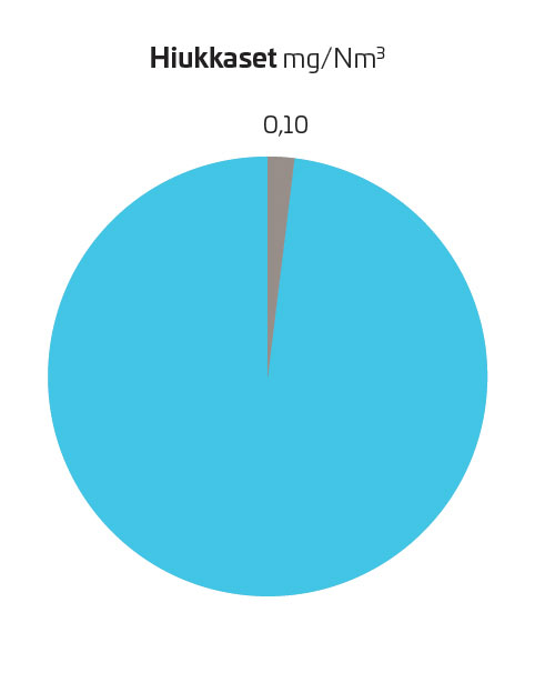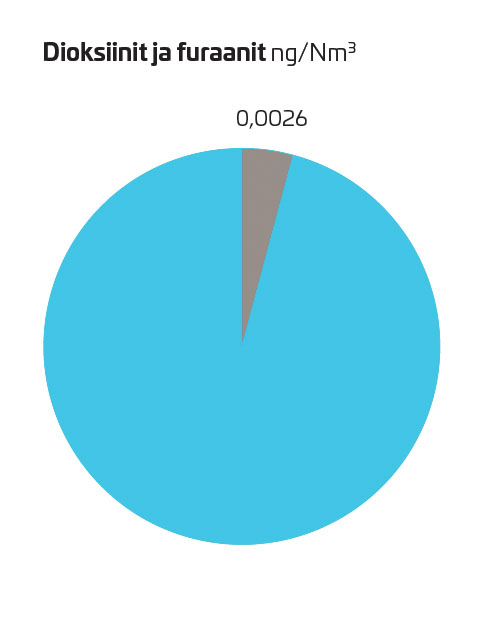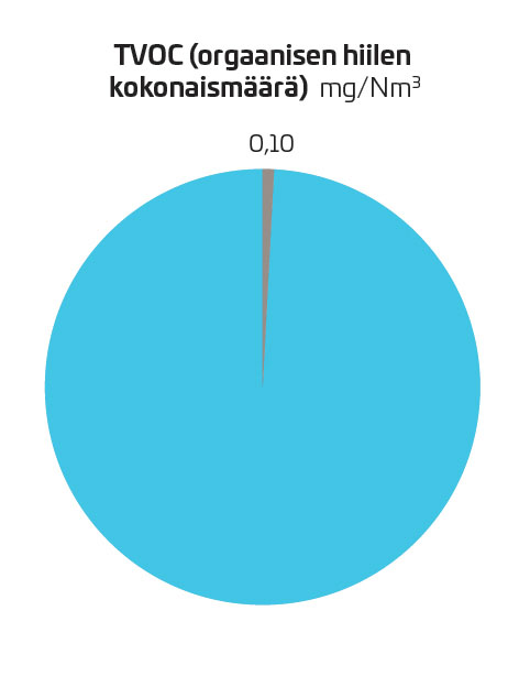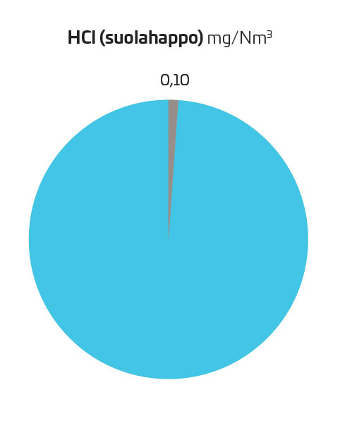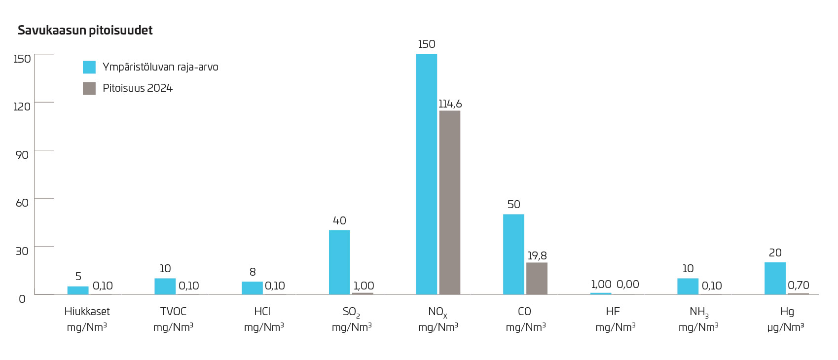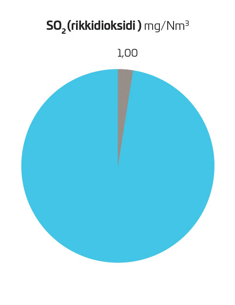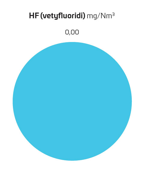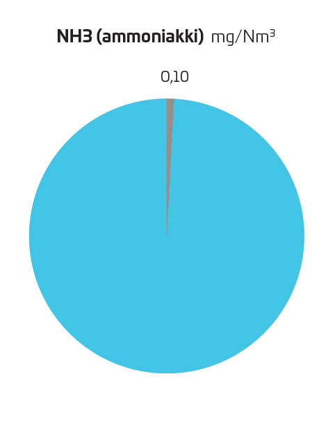 Ilmanpäästöjen seuranta on yksi ympäristövaikutusten seurannan keskeisistä osa-alueista. Tarkkailemme ilmanpäästöjä jatkuvatoimisesti ja raportoimme niistä säännöllisesti viranomaisille. Alla olevassa diagrammissa on esitetty vuoden 2024 mittaustulokset: kokonainen ympyrädiagrammi merkitsee ympäristöluvassa määriteltyä raja-arvoa epäpuhtaudelle ja ympyrän sisään merkitty harmaa alue osoittaa toteutuneen pitoisuuden.